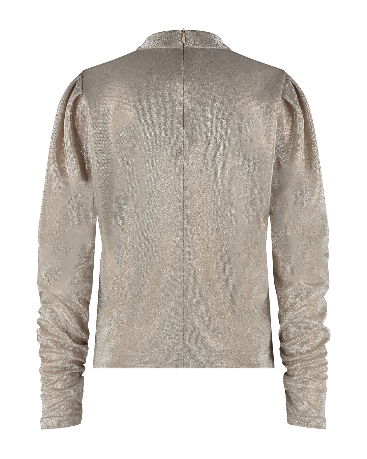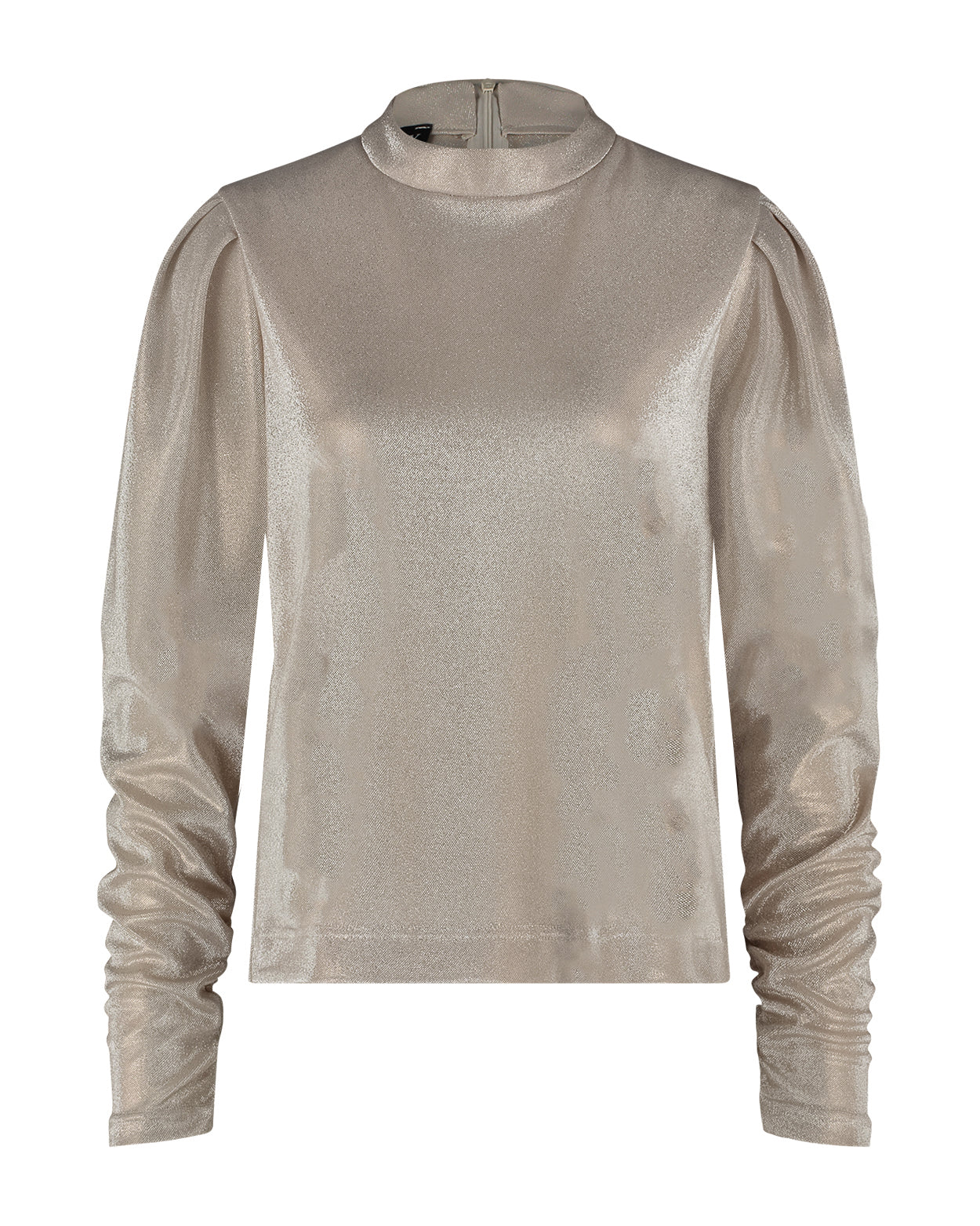 Deze top voegt een vleugje glamour toe aan je outfit. De glanzende stof vangt het licht op een verfijnde manier, terwijl de hoge hals en subtiele schouderplooien zorgen voor een elegante uitstraling. De pasvorm maakt het geheel comfortabel én stijlvol.