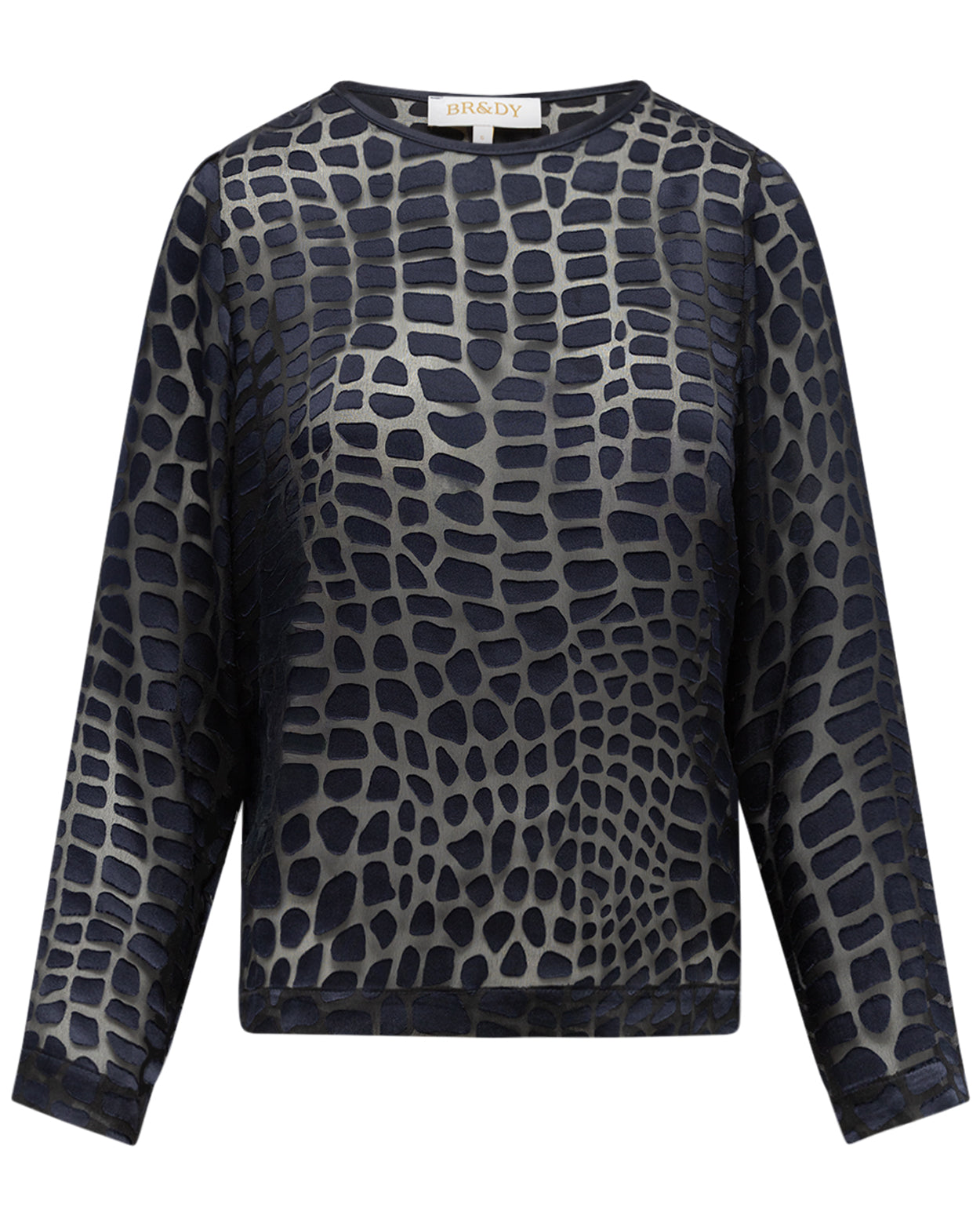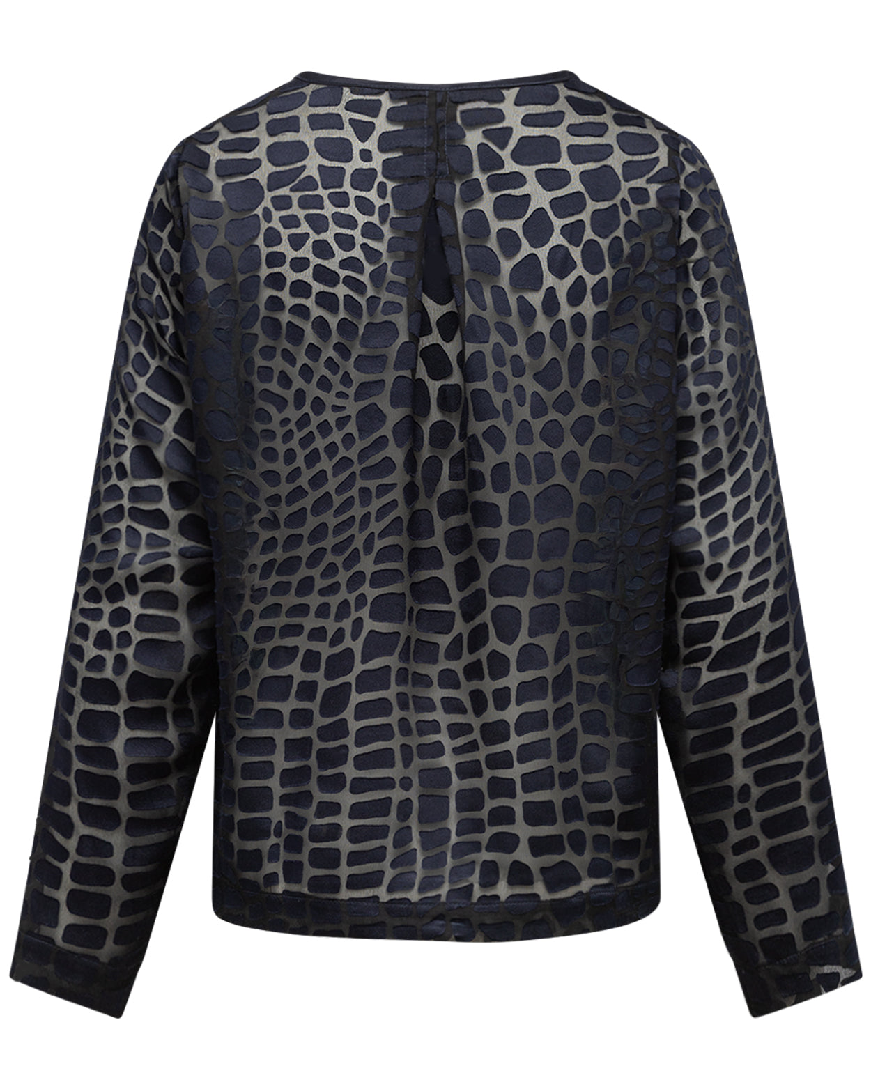 Deze blouse is een eyecatcher die elegantie en fashion perfect combineert. De stof heeft een subtiel patroon wat een luxe uitstraling geeft, terwijl de ronde hals en semi-transparante finish zorgen voor een moderne, vrouwelijke look. Ideaal voor wie houdt van verfijnde details met een edgy twist.