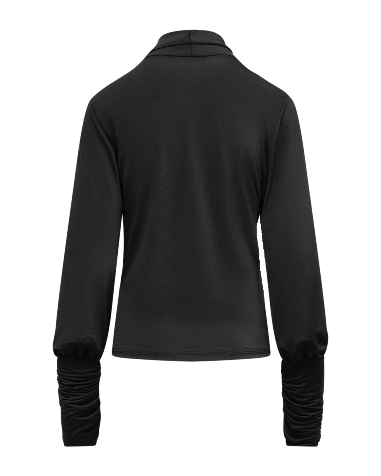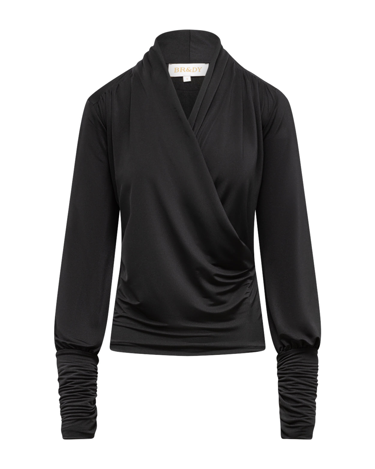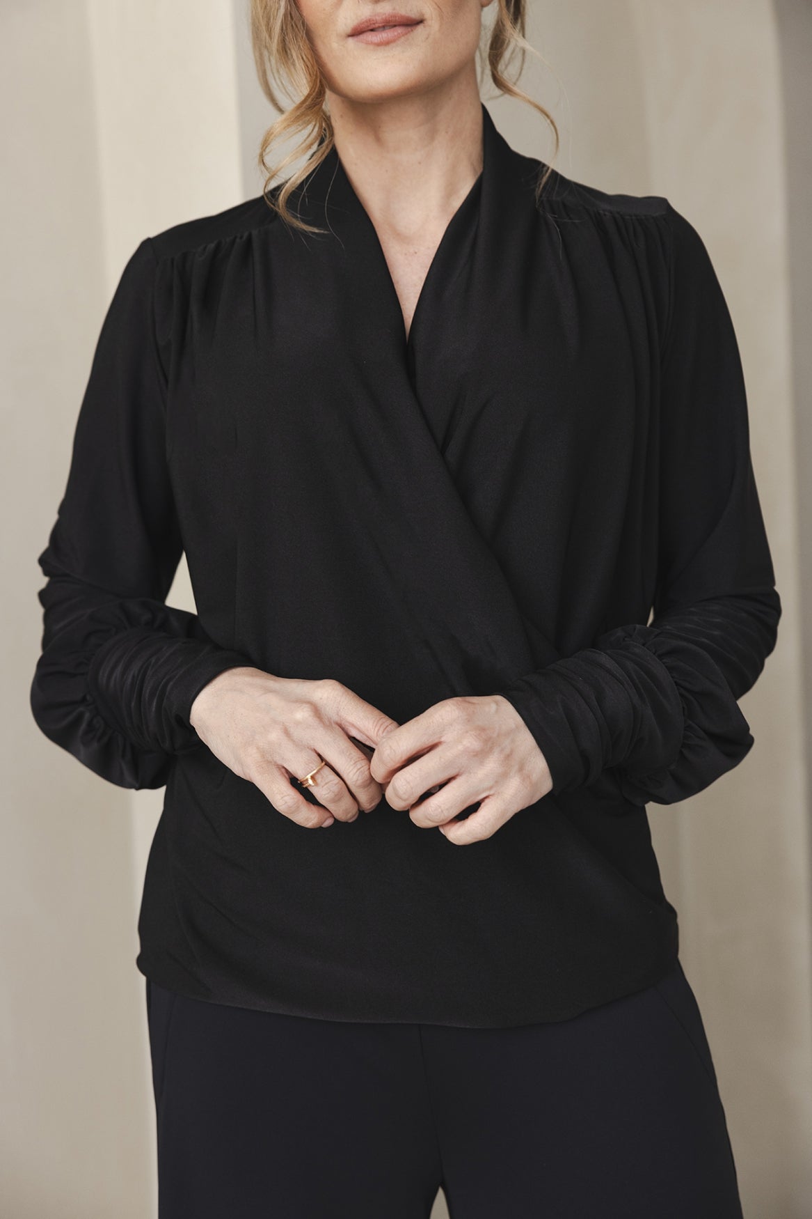 Deze overslagtop is een stijlvolle aanvulling op je garderobe. De glanzende, zachte stof valt soepel en vormt een elegante V-hals, die de top een verleidelijk en verfijnd karakter geeft. De rimpels bij de schouders en de licht gepofte mouwen met plooien bij de polsen zorgen voor een vrouwlijke en comfortabele pasvorm.