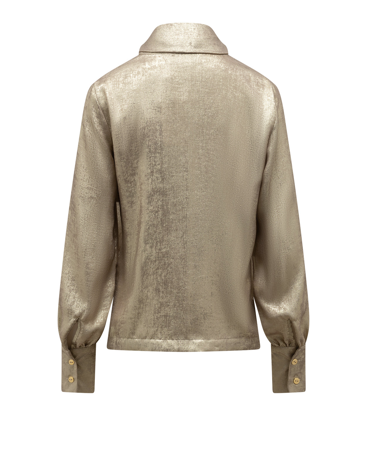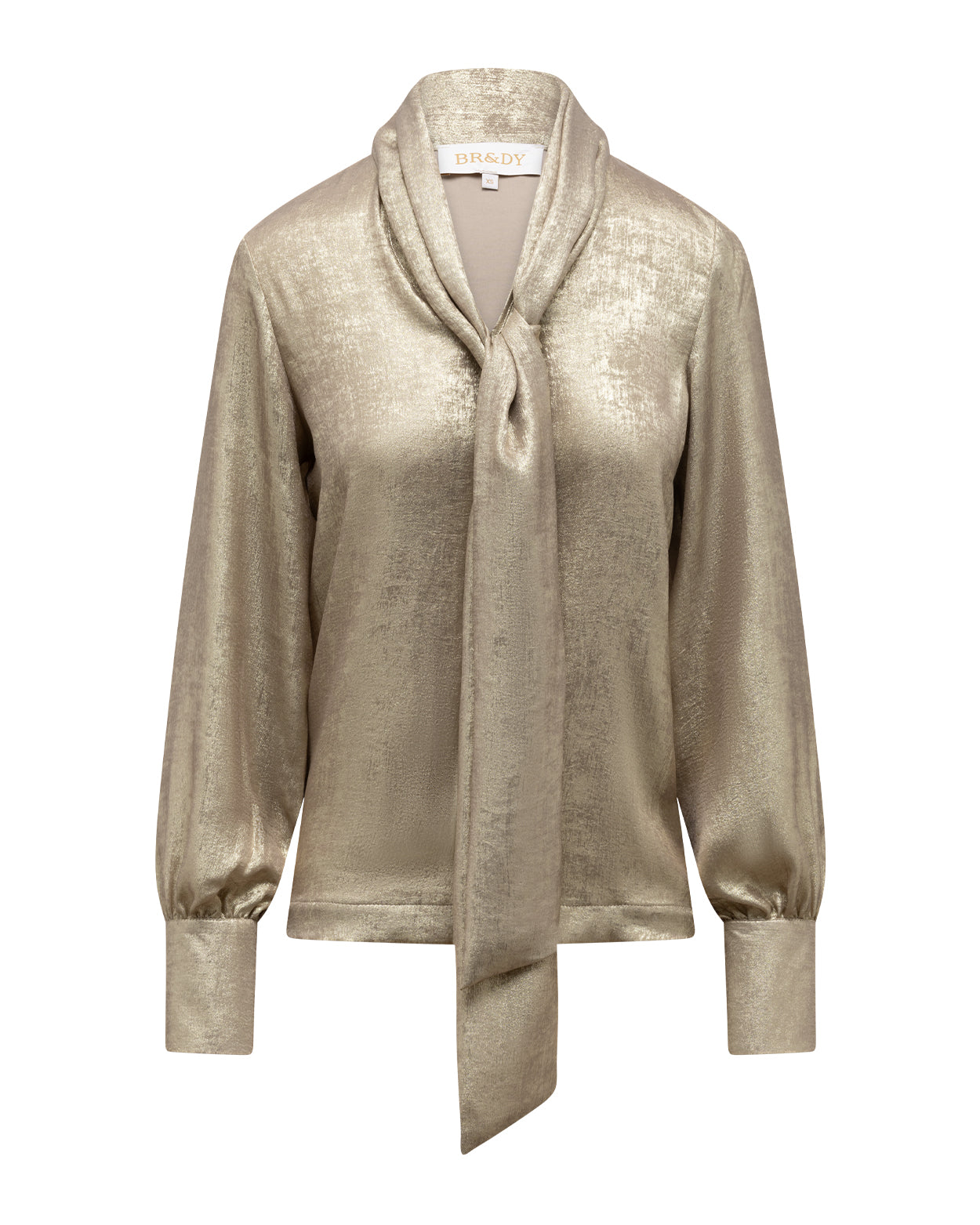 Deze glanzende strikblouse in metallic is de perfecte balans tussen chic en modern. De glanzende, textuurstof vangt het licht op een prachtige manier, terwijl de sjaalkraag en knoopdetails zorgen voor een verfijnde afwerking die zorgen voor een eye catching outfit.