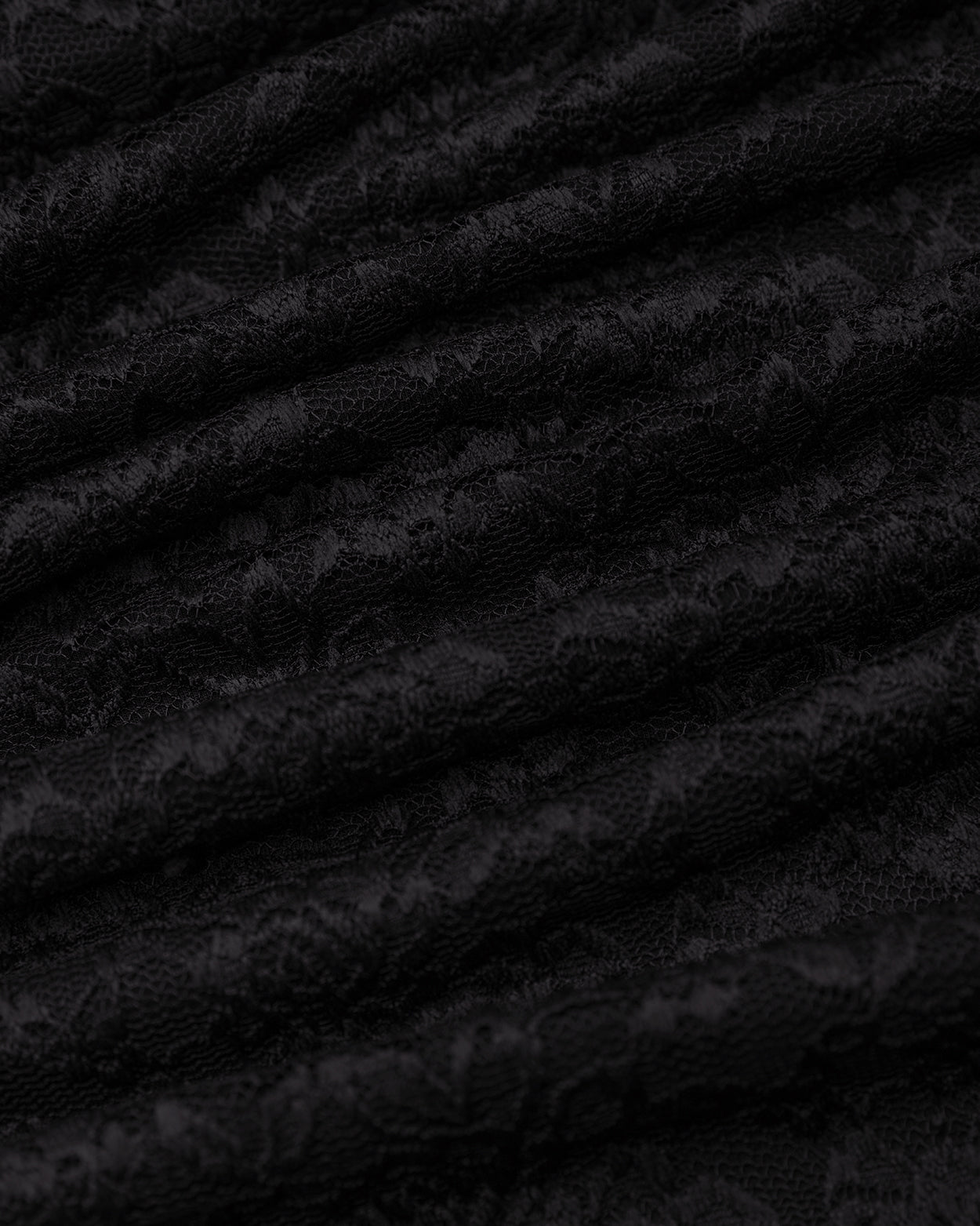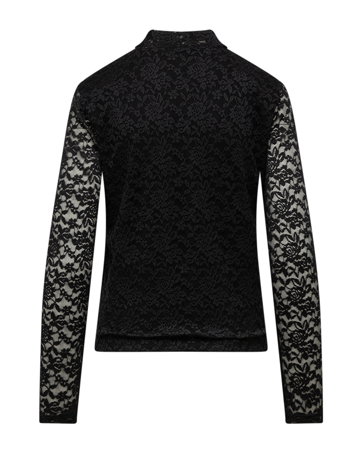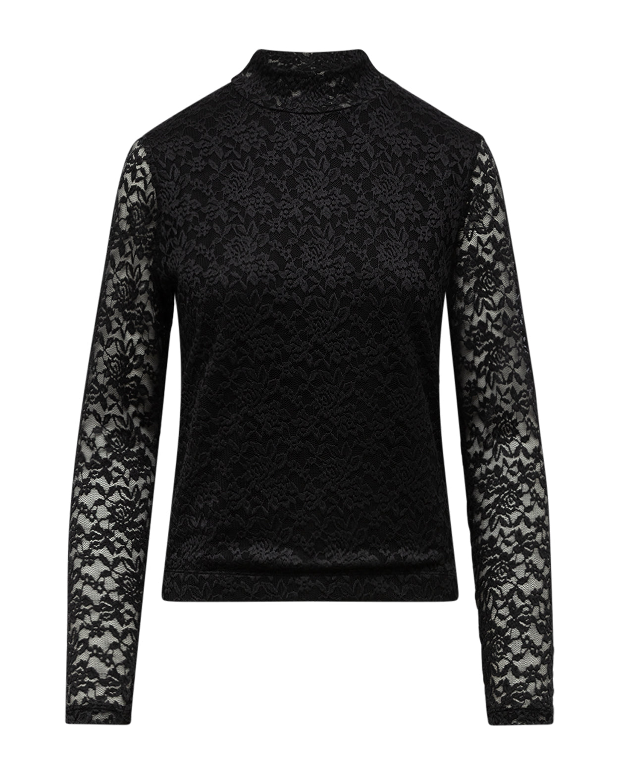 Deze top met kanten bloemenmotief straalt klasse en verfijning uit. Het delicate kant met prachtig bloemendetail creëert een luchtige en elegante uitstraling, terwijl de hoge hals en lange mouwen de top een chic en modern silhouet geven. Het voor- en achterpand van de top zijn gevoerd terwijl de mouwen het kant mooi op de huid laten zien.