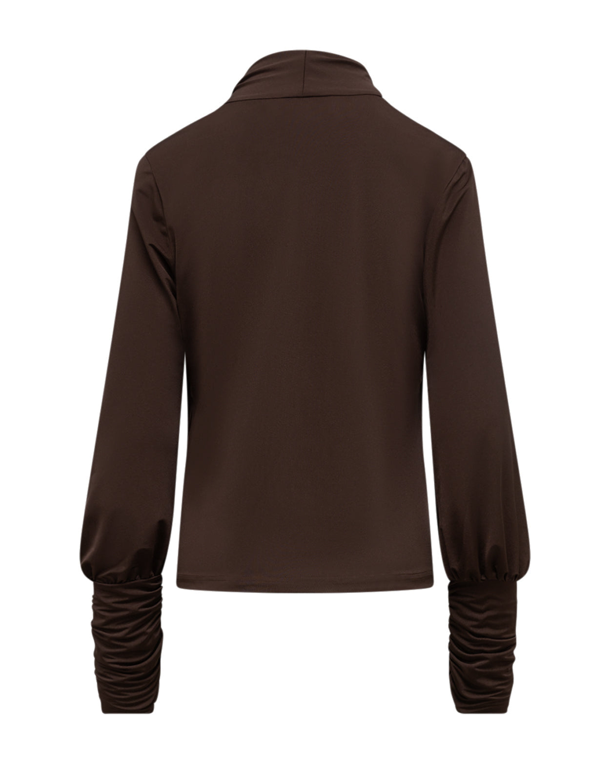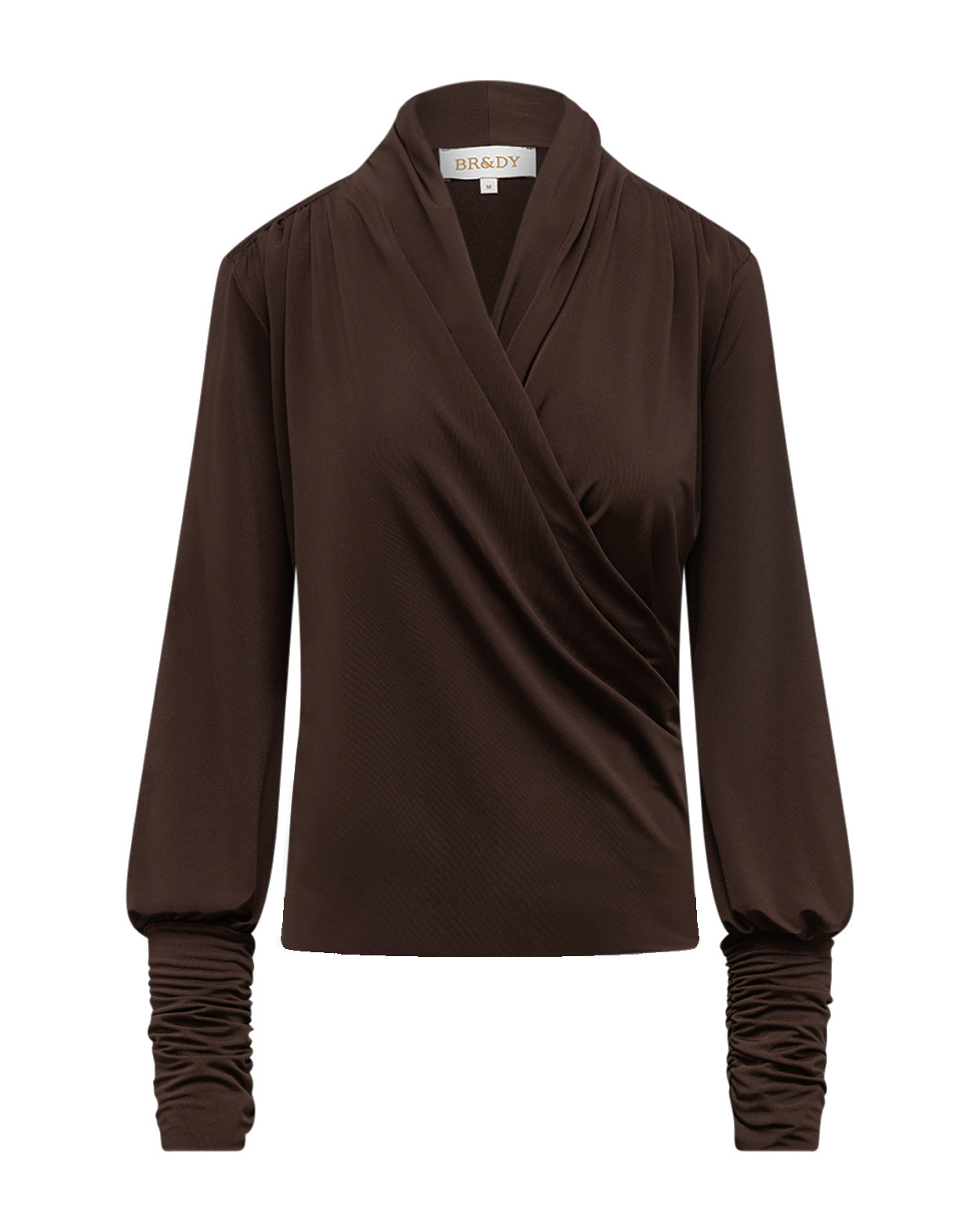 Deze overslagtop is een stijlvolle aanvulling op je garderobe. De glanzende, zachte stof valt soepel en vormt een elegante V-hals, die de top een verleidelijk en verfijnd karakter geeft. De rimpels bij de schouders en de licht gepofte mouwen met plooien bij de polsen zorgen voor een vrouwlijke en comfortabele pasvorm.