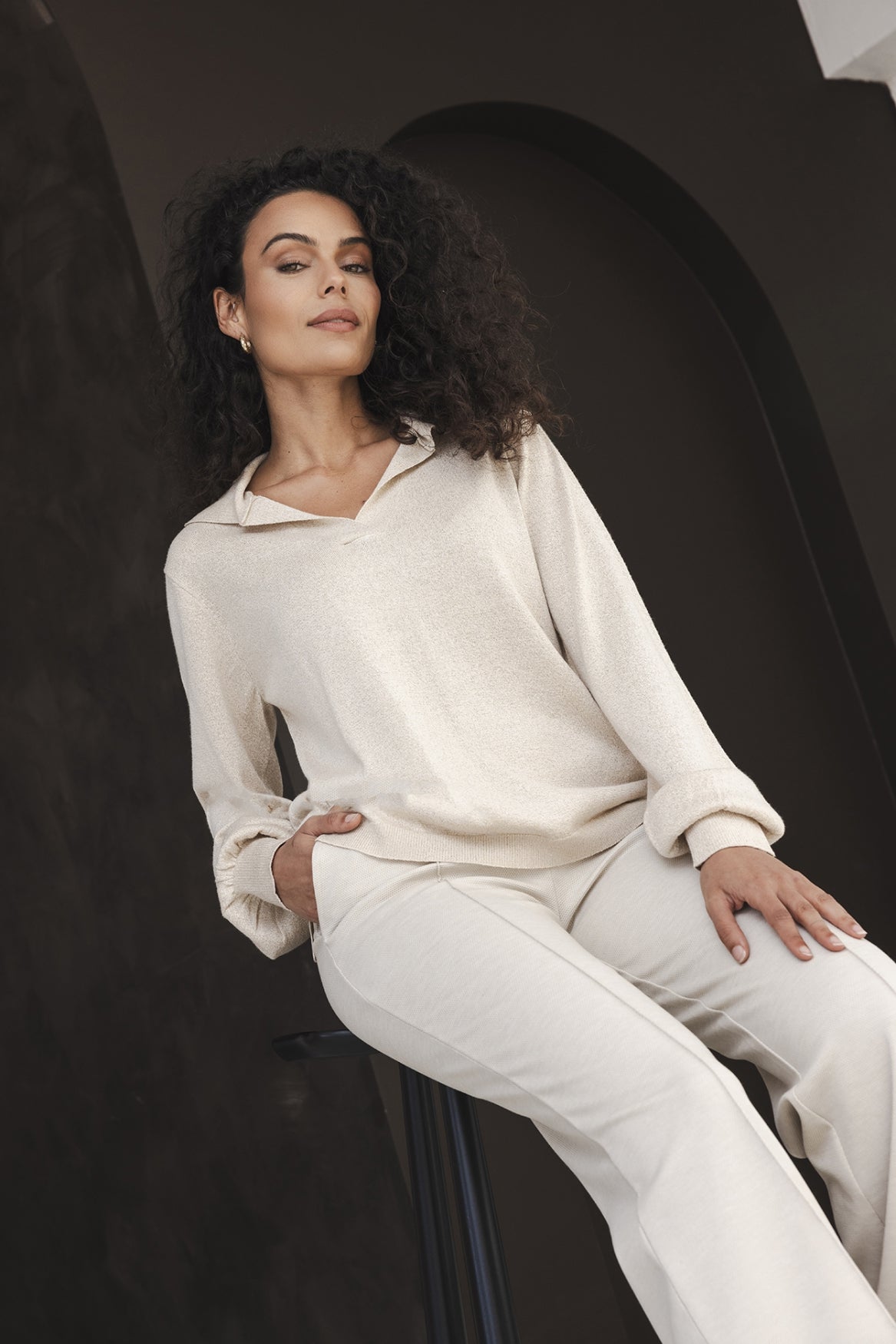 Deze polo top van soepele glitter brei is de perfecte combinatie van casual en chic. De zachte, licht glanzende stof biedt een cozy feel, terwijl de open V-hals en polokraag zorgen voor een tijdloze uitstraling. Met zijn losvallende pasvorm en zachte textuur is deze top te dragen bij elke gelegenheid.