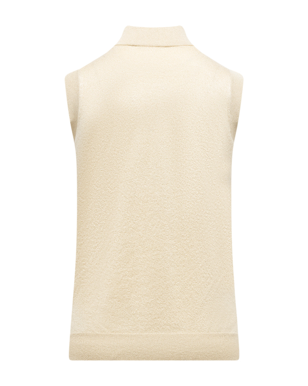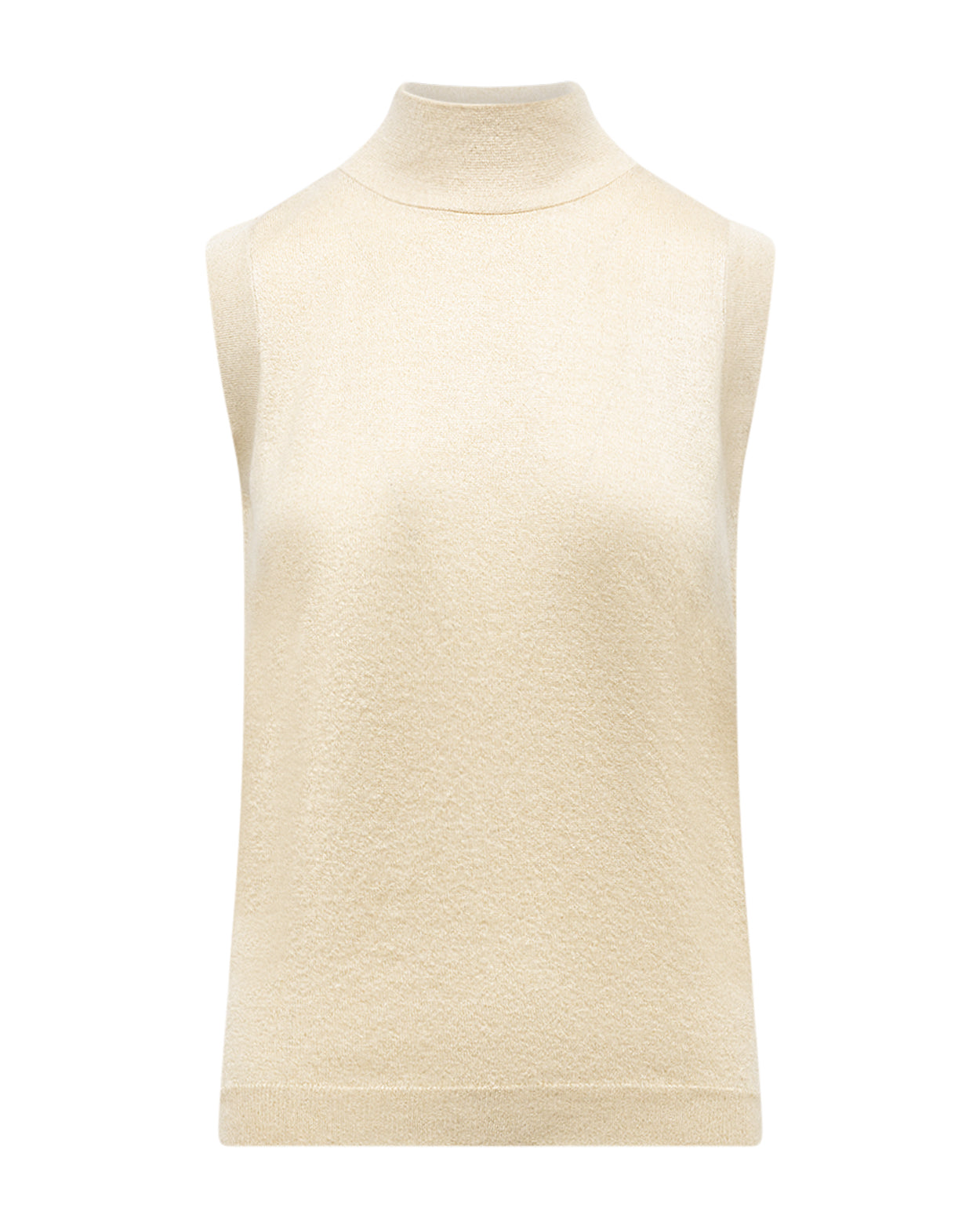 Deze turtleneck top combineert casual met chic. De zachte stof heeft een subtiele glitter en voelt comfortabel aan, terwijl de hoge halslijn en strakke, mouwloze snit zorgen voor een gestroomlijnde, minimalistische look.