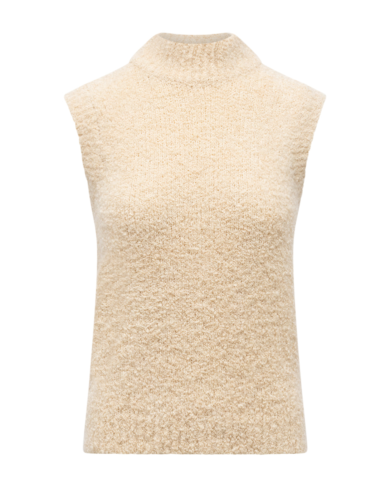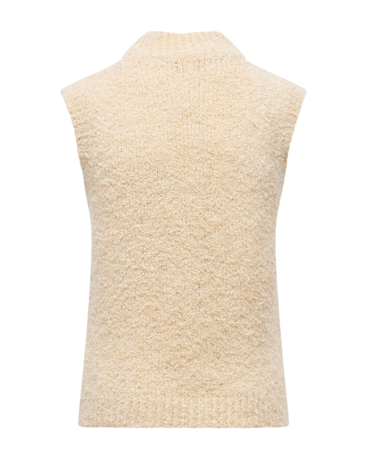 Deze mouwloze trui in het bouclé is een perfecte mix van comfort en stijl. De hoge hals en subtiele ribboorden geven de spencer een moderne uitstraling, terwijl de zachte textuur zorgt voor een heerlijk comfortabel gevoel. Ideaal voor laagjes in de herfst of als statement piece op een frisse lentedag.