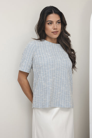Deze bouclé top combineert een verfijnde textuur met ultiem draagcomfort.De zachte mix van lichtblauwe en witte tinten geeft de top een frisse, moderne uitstraling, terwijl de subtiele structuur van de bouclé‑stof zorgt voor eenluxe, rijke look. Dankzij de toegevoegde stretch vormt de top zich soepel naar het lichaam zonder strak te zitten,ideaal voor zowel werk als vrije tijd.