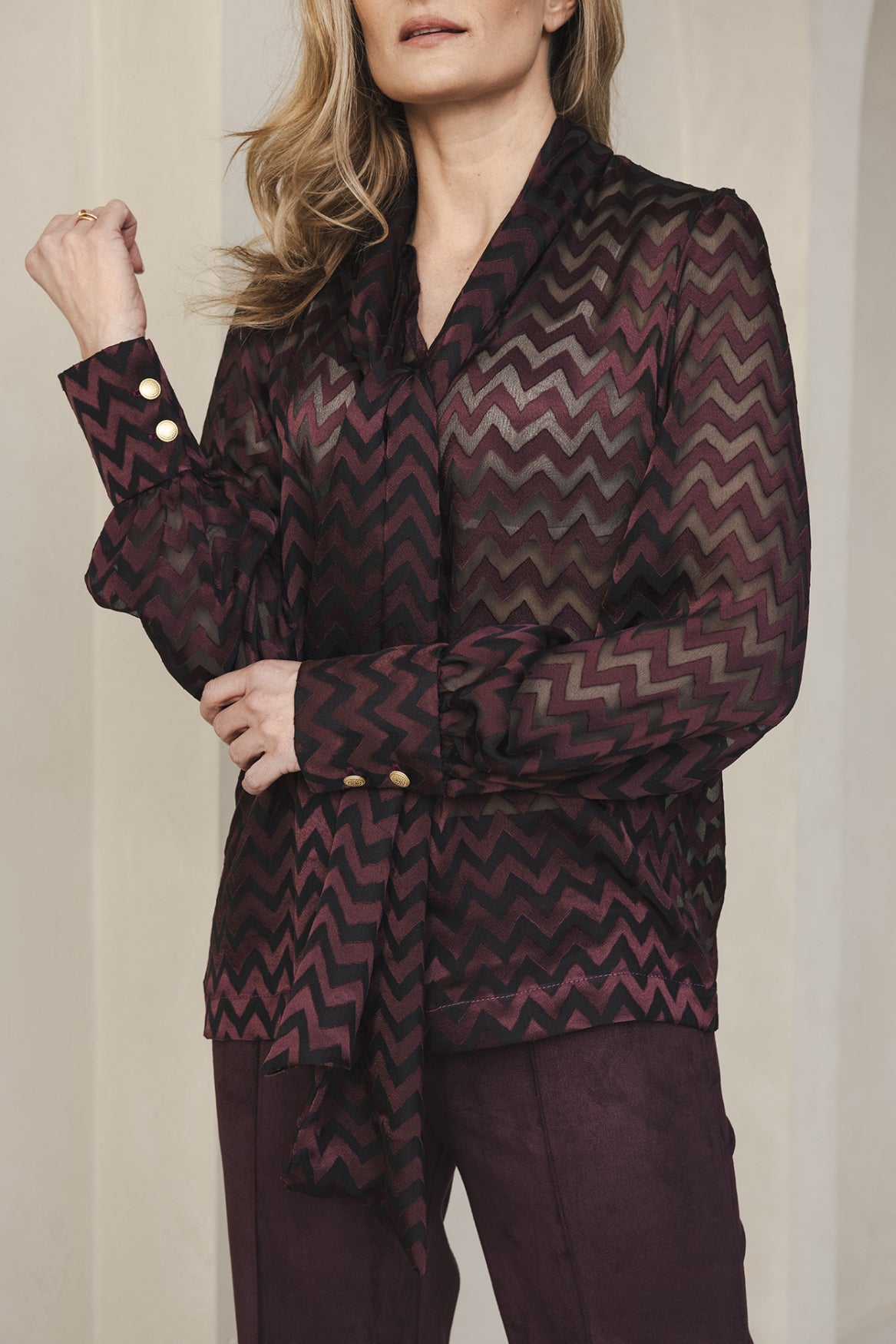 Deze strikblouse is een eyecatcher in je garderobe, gekenmerkt door een subtiel patroon dat de stof een rijke textuur geeft. De lange sjaalkraag met strikdetail en de goudkleurige knopen maken deze blouse tot een elegant statement piece dat zowel tijdloos als modern is.