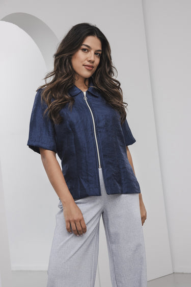 De tweeweg‑rits aan de voorkant maakt het ontwerp niet alleen bijzonder, maar ook functioneel. Je bepaalt zelf hoe ver je de rits opent of sluit, waardoor je moeiteloos varieert tussen een casual open look of een meer gesloten, geklede stijl. De subtiele textuur in de stof geeft het geheel extra diepte en maakt dit blousje een echte eyecatcher.